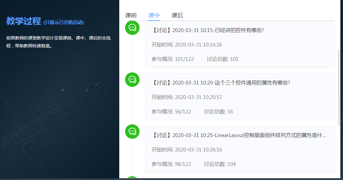 借助职教云“今日课堂”的功能,实现了课前任务发布,课中签到讨论测试,课后总结布置作业的教学流程,保证学生的学习质量。