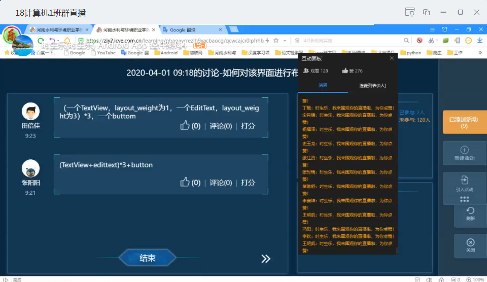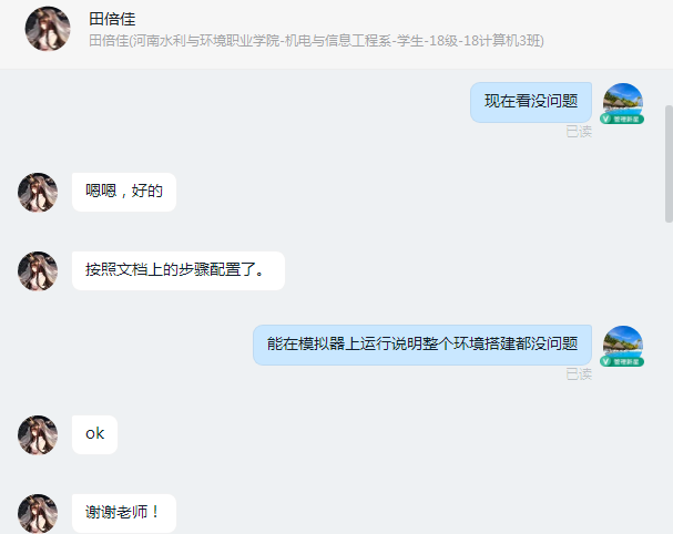 疫情还在延续,线上教学仍在继续。信息工程系老师时生乐承担了18级计算机1-3班Android课程线上授课任务。由于老家设备受限,为了不耽误正常线上授课,他提前回到郑州备课,学习职教云、钉钉等平台和软件的使用,积极向第一批网上授课的老师学习网上授课经验,认真听取意见建议,为授课打下良好基础。由于课前准备充分,时生乐老师在直播软件使用、课程讲授、师生互动等方面都取得了良好的效果。
