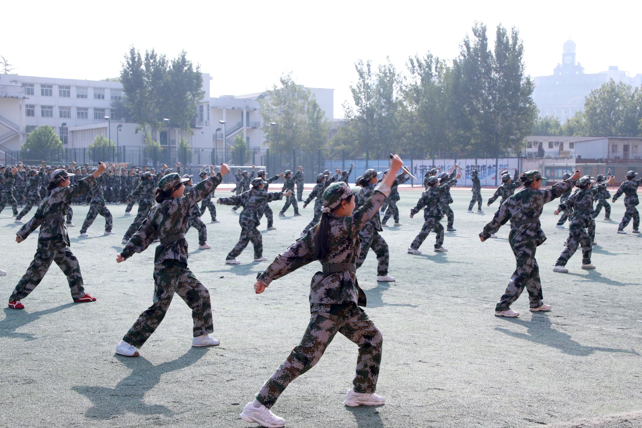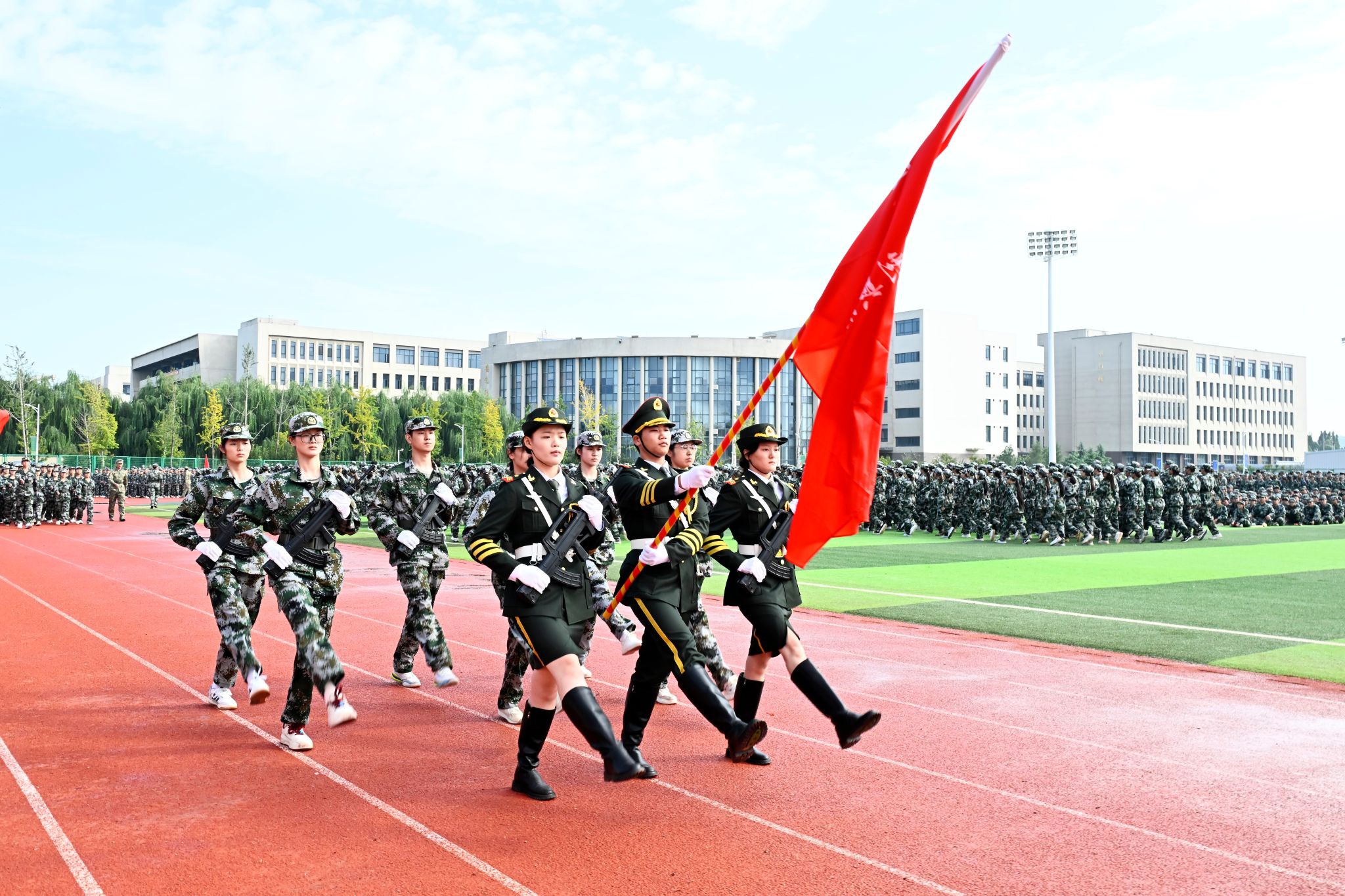 伴随着激昂的《分列式进行曲》,我校8000余名新生身着迷彩、昂首挺胸,以铿锵正步接受检阅,用一场热血的青春“阅兵式”,向新中国76周年华诞致敬。护旗方阵步伐精准,75厘米标准正步尽显庄严;数字方队、擒敌拳方队、刺杀操方队、战术方队、应急棍方队依次亮相,刚劲动作与嘹亮呼号交织,奏响青春强音,生动展现新生历经军训磨砺的昂扬风貌。