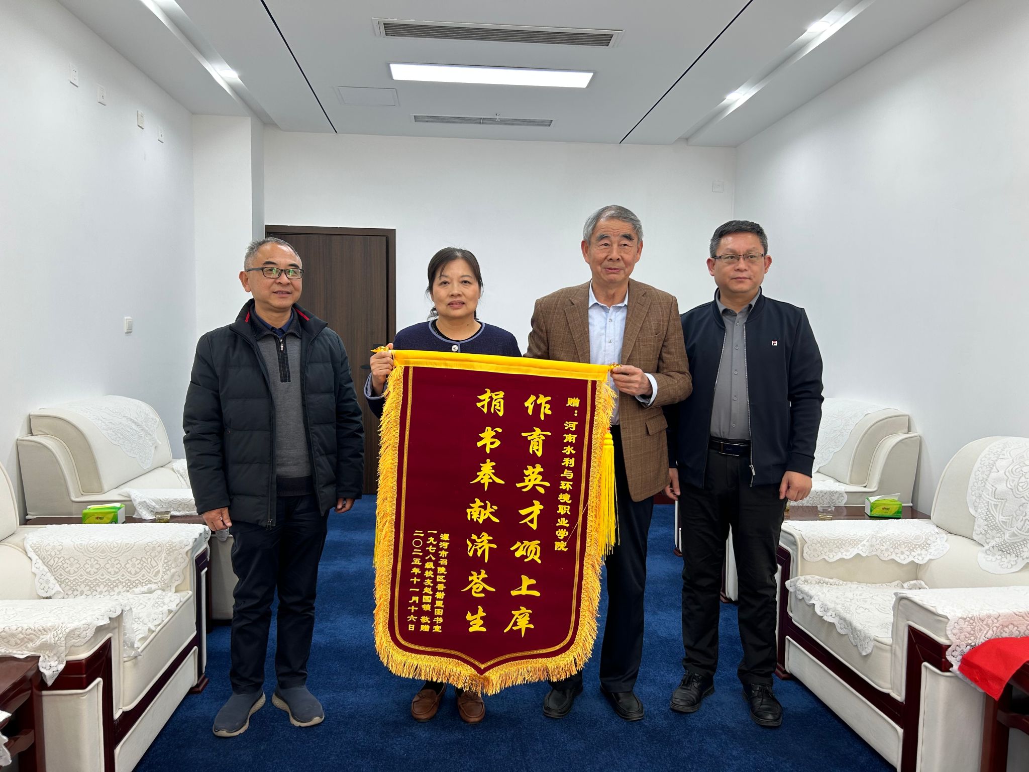 11月18日下午,我校1978级校友、全国离退休干部先进个人、“中国好人”荣誉获得者、漯河市委宣传部原常务副部长赵国锁专程返校,在航空港校区举行赠旗仪式,将一面镌刻“作育英才颂上庠 捐书奉献济苍生”的锦旗赠予学校,以此感谢母校为其创办的社区图书室捐赠书籍。校长李志萍、副校长包永刚及对外联络与合作中心相关人员参加仪式。