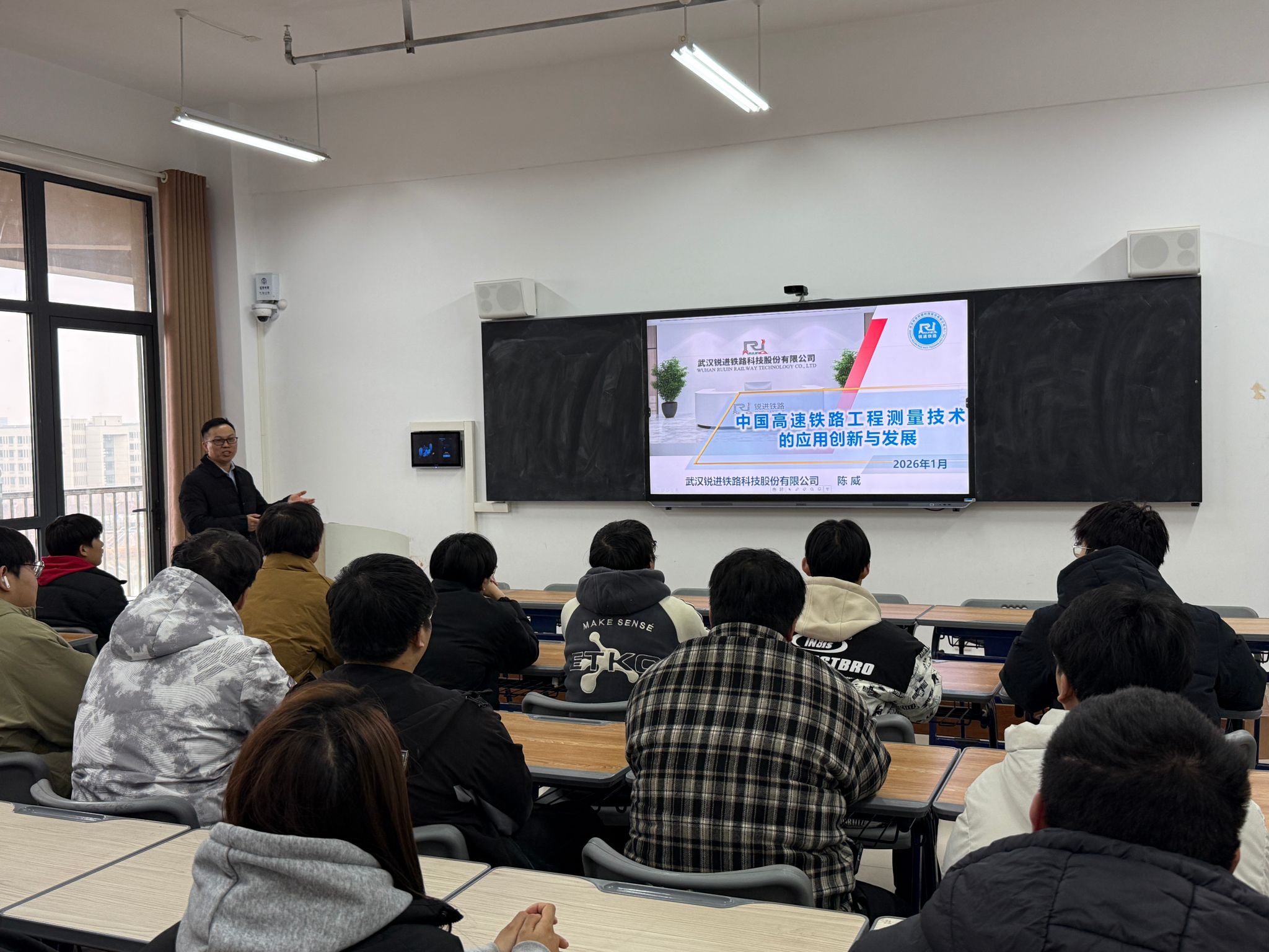 开班仪式结束后,武汉锐进铁路科技股份有限公司总工程师陈威应邀为全体同学作《中国高速铁路工程测量技术的应用创新与发展》专题报告。报告中,陈威系统梳理了高铁测量技术的发展演进脉络,深入解读行业现行技术标准,并结合行业前沿动态,为同学们剖析未来职业发展方向,帮助大家精准把握岗位需求与行业发展趋势。