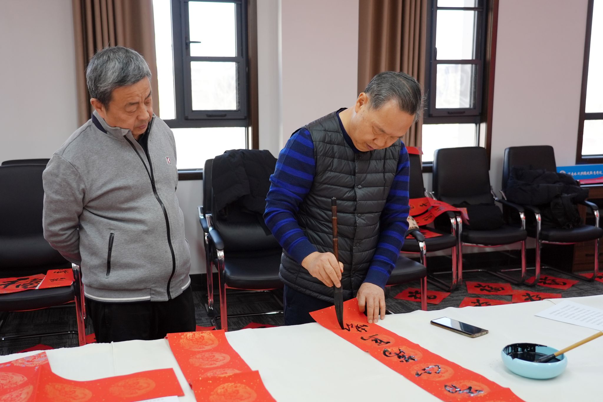 活动特邀河南水利书法协会6位书法家挥毫献艺,我校书法爱好者也踊跃参与、同台创作。活动现场暖意融融,红纸铺展,翰墨飘香。书法家与爱好者们凝神聚气、笔走龙蛇,将平安喜乐、和谐祥瑞的美好寓意融入一撇一捺之中,一副副对仗工整、寓意吉祥的春联,一个个遒劲有力、饱含温度的“福”字跃然纸上,浓浓的年味随着墨香扑面而来。