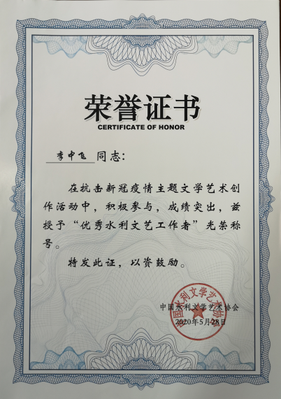 在中国水利文学艺术协会组织开展的水利系统抗击新冠疫情主题文学艺术创作活动中,鲁兵、文琳、李中飞三名同志分获“优秀水利文艺工作者”称号,此项活动旨在进一步发挥典型的激励、示范、引领作用,引导广大水利文艺工作者不忘初心、牢记使命,推进水利系统精神文明建设和水利文化艺术繁荣发展。