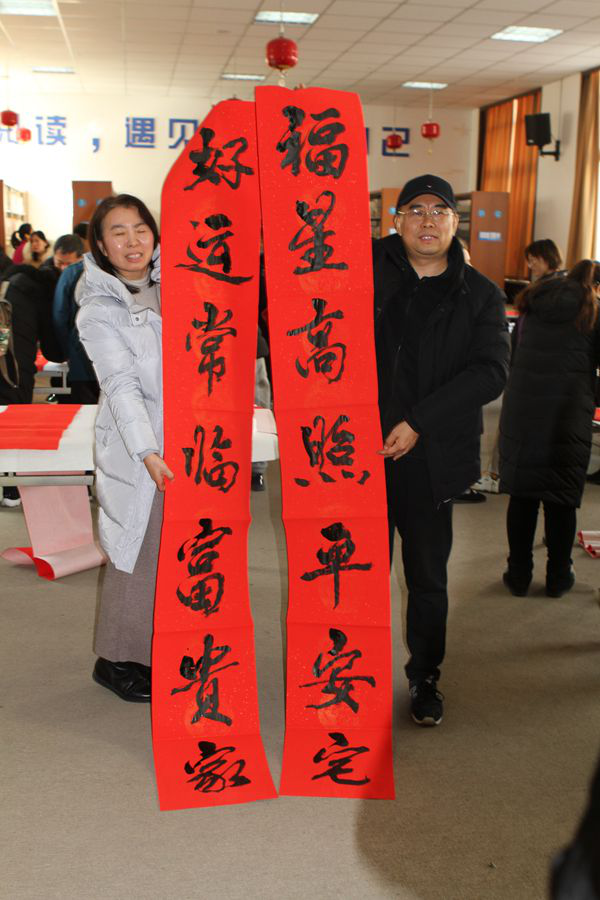 春节是中华民族祈福迎祥的传统节日,贴春联是中国人过春节的文化传统之一,写春联送喜庆更是弘扬中华民族优秀传统文化的良好形式。教职工们纷纷表示,本次活动不仅让大家得到了新春的祝福,还让大家体会到了书法的艺术魅力,营造了喜庆祥和的节日氛围。在传承弘扬中华优秀的传统文化的同时,丰富了教职工的精神文化生活,大家将以更加饱满的热情迎接新年的到来,只争朝夕、不负韶华,在新的一年为我校的发展做出努力!