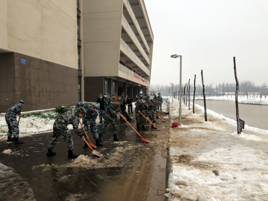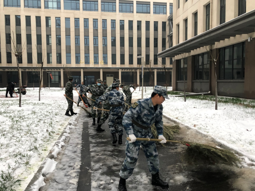 2月24日,郑州的第一场大雪飘然而至,航空港校区银装素裹。但积雪、融雪也使道路湿滑难行,给军训学生带来了不便。为确保师生出行安全,2月25日晨训结束后,校武装部和航空港校区管委会召集30多名驻训教官开展义务铲雪工作。