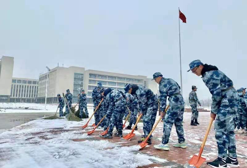 为进一步贯彻落实大学生立德树人任务,践行社会主义核心价值观。我校武装部抓住时机,创新立德树人教育方式,组织军训学生开展除雪劳动教育实践活动。