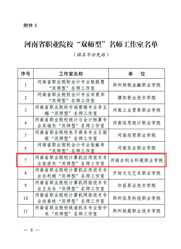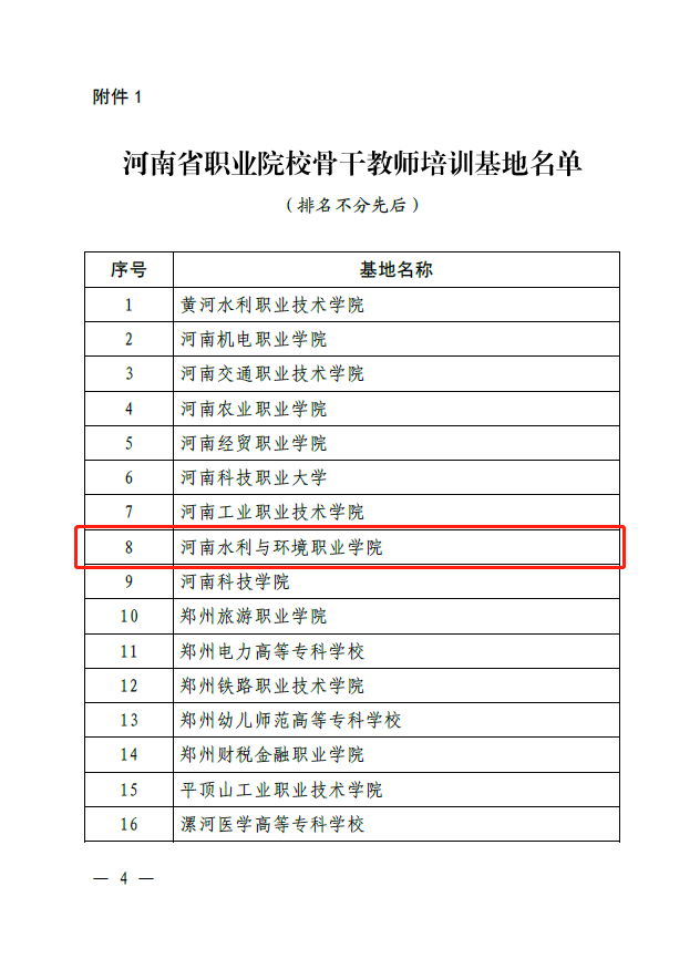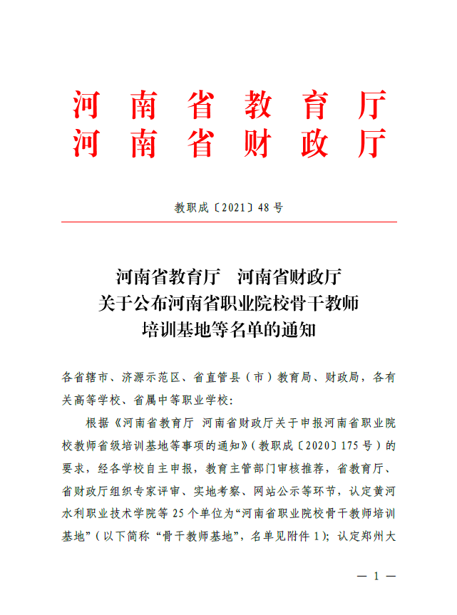 近日,河南省教育厅和河南省财政厅联合下发《关于公布河南省职业院校骨干教师培训基地等名单的通知》(教职成〔2021〕48号),我校荣获“河南省骨干教师培训基地”“河南省职业院校‘双师型’教师培养培训基地”“河南省职业院校‘双师型’名师工作室”“河南省职业院校教师技艺技能传承创新平台”四项荣誉称号。