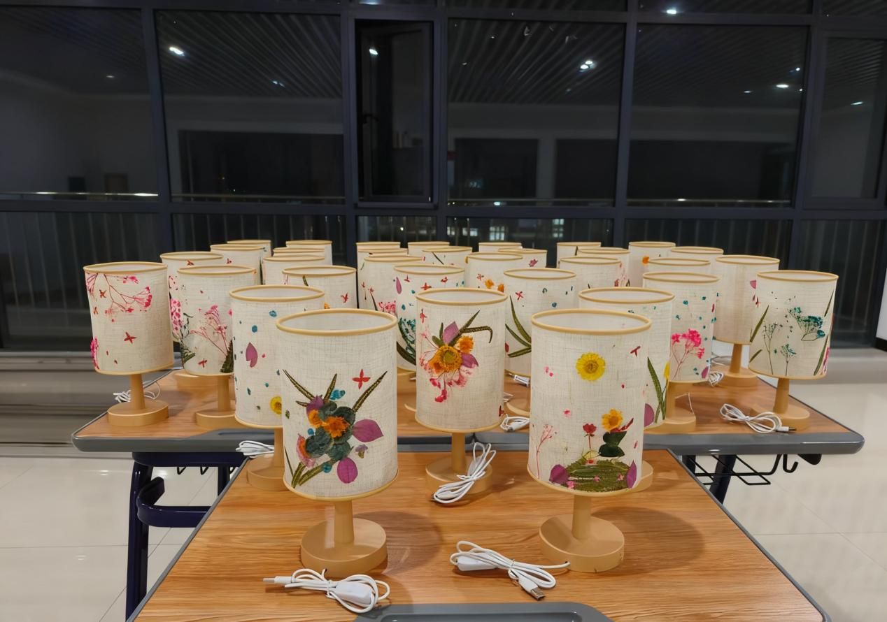 活动现场准备了雏菊、薰衣草、尤加利叶等干花材料,以及环保灯罩、LED灯座与制作工具。同学们在志愿者指导下发挥创意,精心构图、粘贴,将自然之美凝驻于灯罩之上。创作过程中,大家沉浸于手工乐趣,在专注中舒缓压力,并通过交流互动增进情感联结。