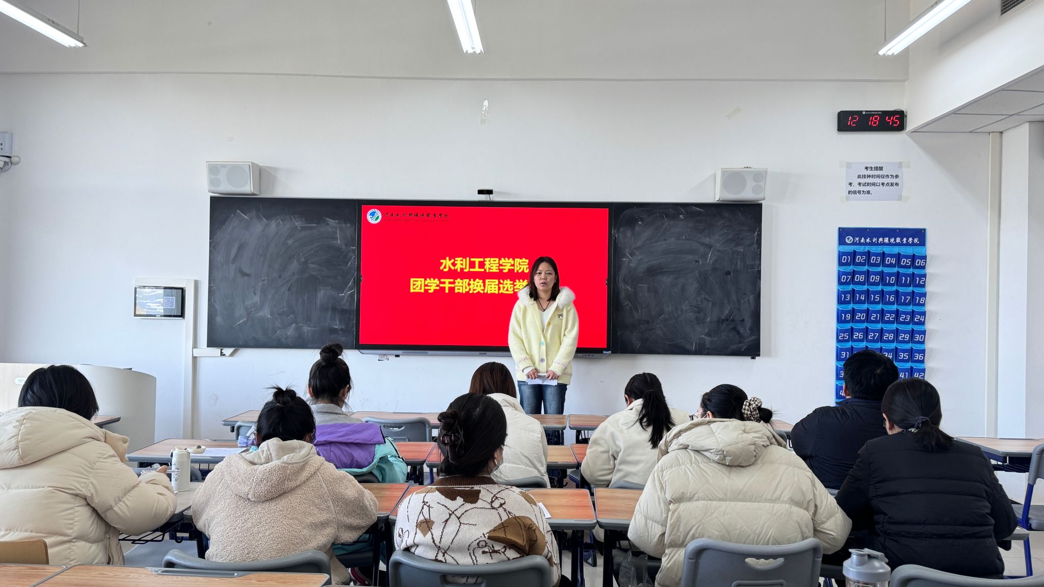 为加强学生干部队伍建设,推动团学工作民主化、规范化发展,12月3日,水利工程学院举行团学干部换届选举大会。学院党总支书记张翼,党总支副书记宋洁,团学办公室主任郭苑及专兼职辅导员参加。