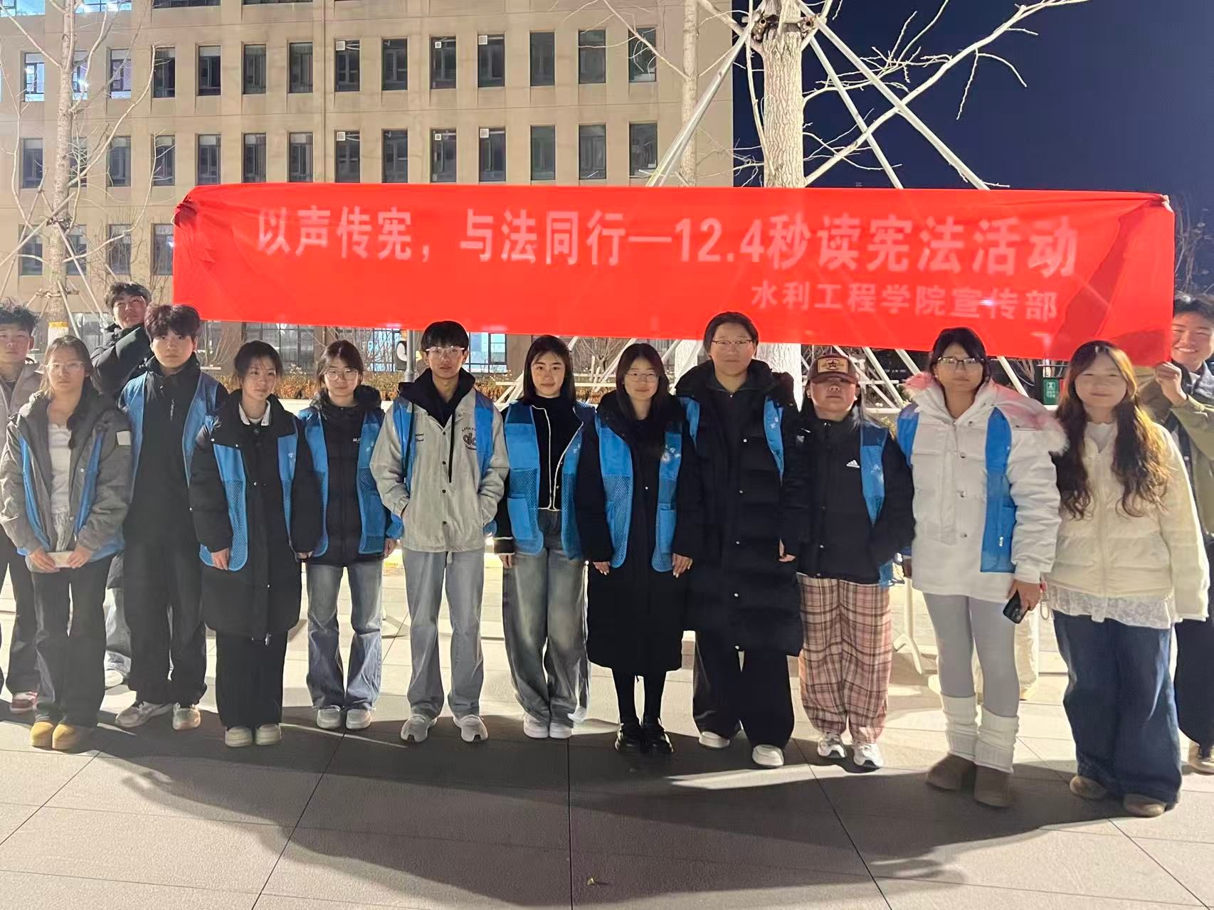 水利工程学院于 12 月 4 日组织开展“以声传宪,与法同行——12.4 秒读宪法”主题活动,24、25 级学生踊跃参与。活动前期,同学们主动利用课余时间查阅宪法资料,选取相关条款反复诵读记忆。活动现场,同学们依次上台,手持宪法条文卡片,在 12.4 秒内完成诵读挑战。多数同学准备充分、表达流畅,个别同学虽紧张但坚持完成,展现了认真投入的态度。通过沉浸式诵读,同学们进一步熟悉宪法内容,深刻体会到宪法的庄严神圣,切实增强了法治意识和权利观念。