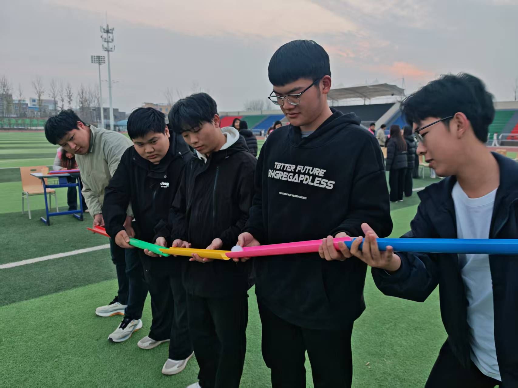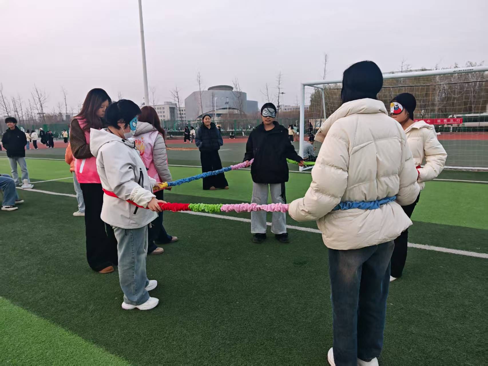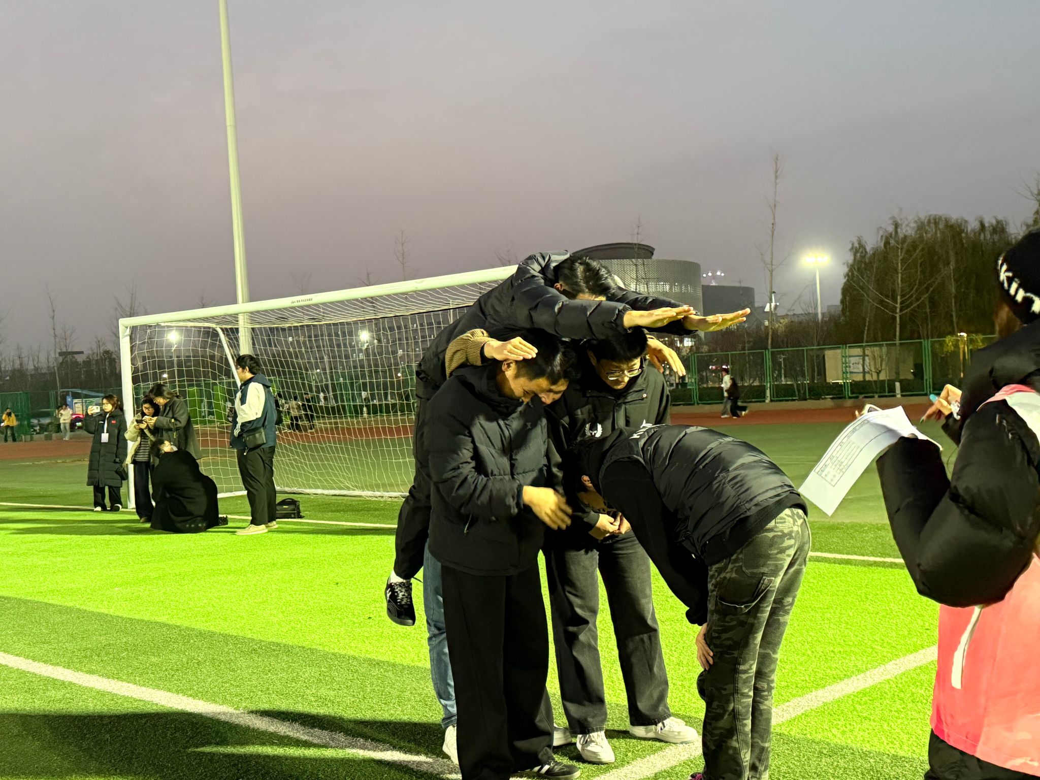 活动现场,各小组依次参与“姓名接龙”“大风吹”“盲人方阵”“珠行万里”“人体字母”等特色项目 。“姓名接龙”快速消除成员间的陌生感,“盲人方阵”着重考验团队信任与沟通效率,“珠行万里”则磨砺了协作耐心与细节把控力。各小组在通关竞速中展现出高度的默契配合与拼搏精神,最终用时最短的队伍脱颖而出。整场活动秩序井然,现场既弥漫着紧张热烈的竞技氛围,又传递着互助友爱的温暖气息。