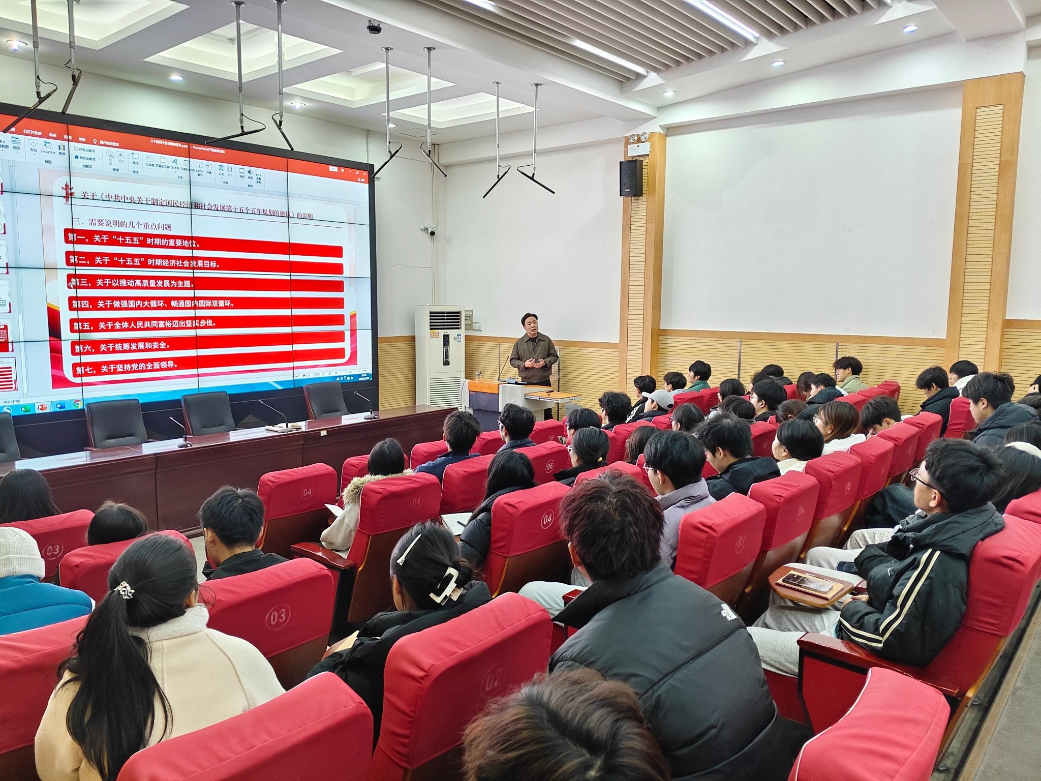 学院党总支书记周颖琦主持并授课,他以《习近平:关于<中共中央关于制定国民经济和社会发展第十五个五年规划的建议>的说明》为核心,从背景意义、核心要义、实践要求三个维度展开剖析。他指出,“十五五”时期是迈向基本实现社会主义现代化的关键阶段,核心是推动经济质的有效提升和量的合理增长,同时详解建设现代化产业体系、高水平科技自立自强等十二大战略任务,鼓励学生将个人发展融入国家大局。
