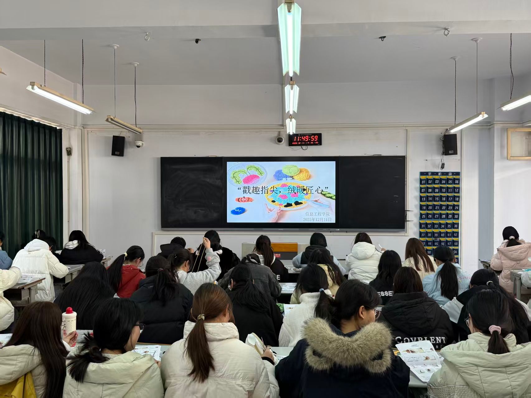 为丰富校园文化生活,为学子搭建多元化课余实践平台,信息工程学院于12月11日中午举办“戳趣指尖,绒暖匠心”毛线戳戳乐活动。学院全体在校生踊跃参与。