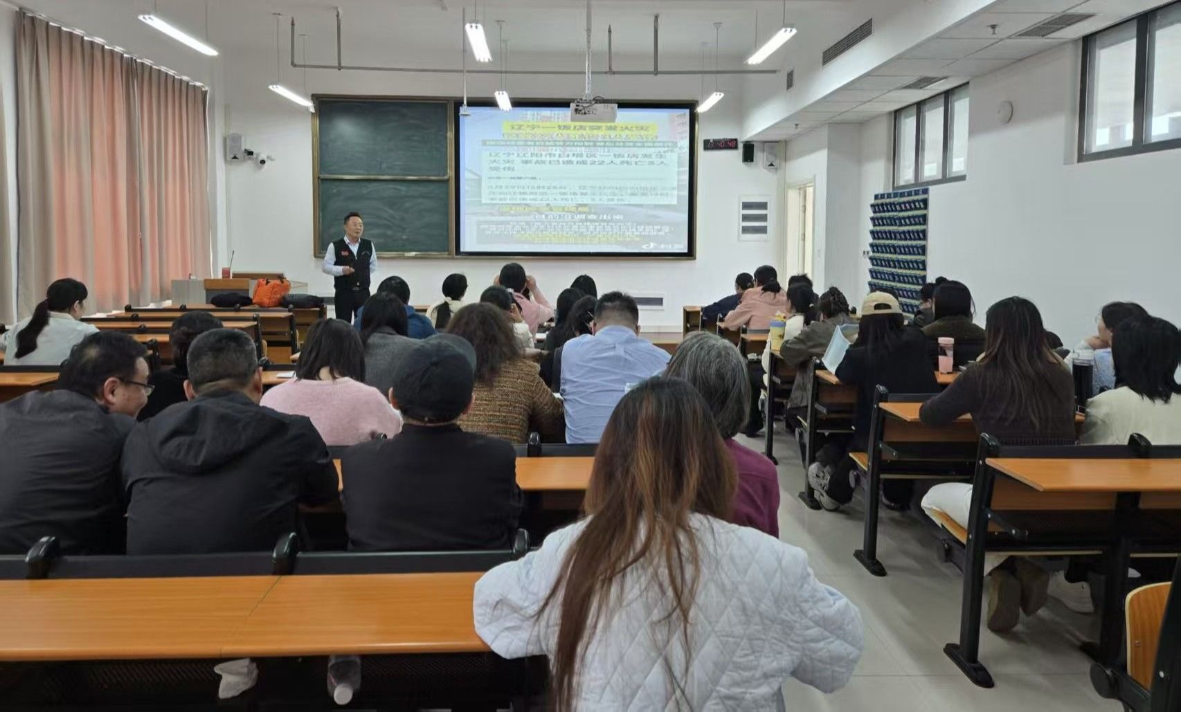 培训期间,王胜达教官围绕“防、灭、逃”三大核心要素,通过多媒体演示与真实案例复盘,系统讲解了日常办公及实验室隐患自查、火灾风险特征、火场疏散黄金法则及灭火器材维护使用等实用知识。教师们学习专注,认真记录要点。随后,全体教职工参与了实战演练,进一步提升了应急避险与自救互救能力。